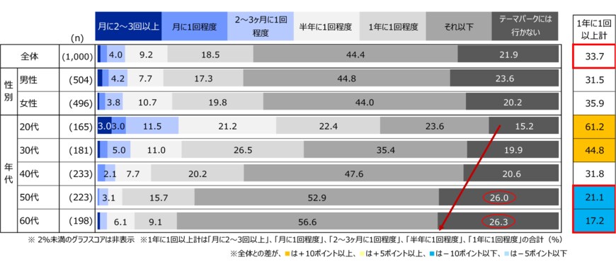 テーマパークに1年に1回以上行く人は全体の33.7%であり、年代別に見ると、20代では6割以上を占めました。一方、50代・60代では「1年に1回以上」の割合が全体より10ポイント以上低く、特に「テーマパークには行かない」と回答した人が多かったことが分かりました。