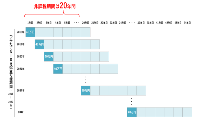 つみたてNISAの非課税期間は20年間のため、今年つみたてNISAで購入した投資商品は2042年末まで非課税で運用可能です。