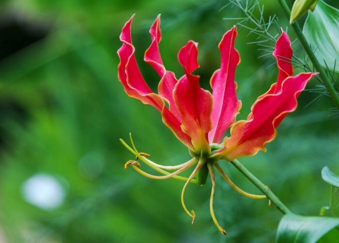 グロリオサは細く反り返った花弁が印象的。花弁はやわらかなウェーブがかかり、フラワーアレンジメントにも人気です。花色は赤・黄・白・ピンク・紫など。