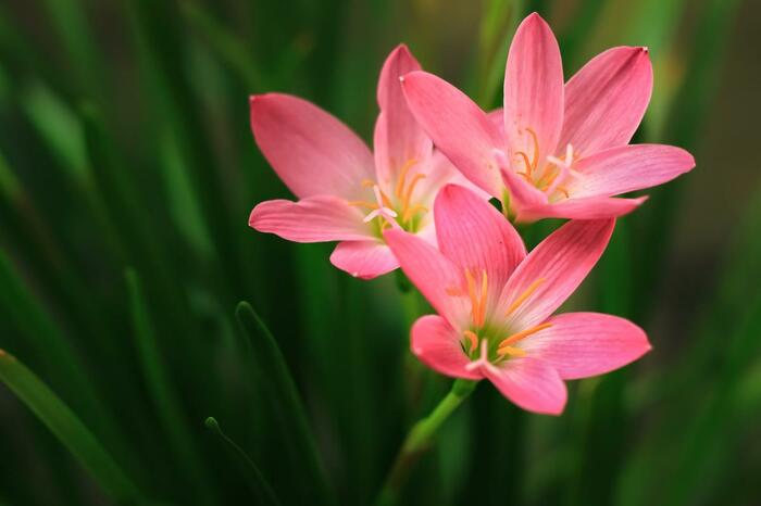 ゼフィランサスは初夏から秋にかけて咲く白やピンクの花が爽やか。雨が降り続くと咲きだすので、「レインリリー」という別名で呼ばれることもあります。