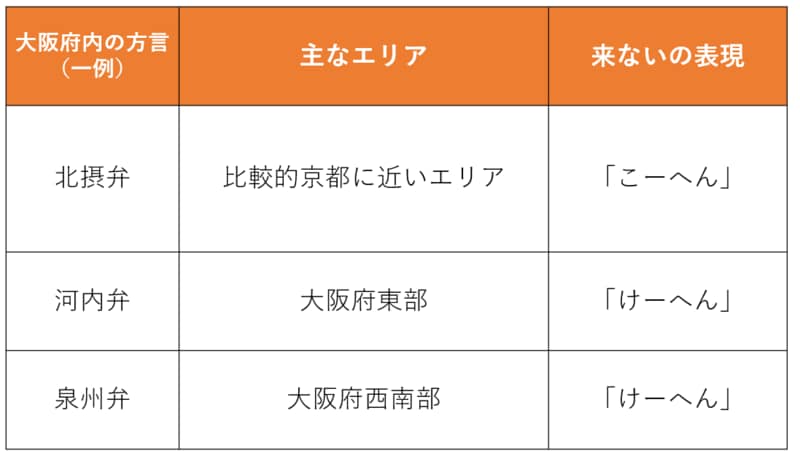 北摂弁では「来ない」を「こーへん」、河内弁・泉州弁では「けーへん」と言ったり、「言わない」も北摂弁で「ゆわへん」と河内弁・泉州弁で「ゆえへん」と表現したりしており、若干の違いが見られますね。