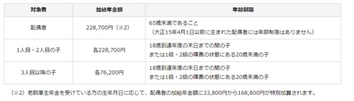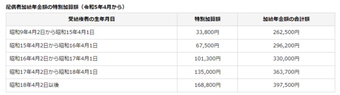 さらに老齢厚生年金を受けている方の生年月日に応じて、配偶者の加給年金額に3万3800円から16万8800円が特別加算されます。
