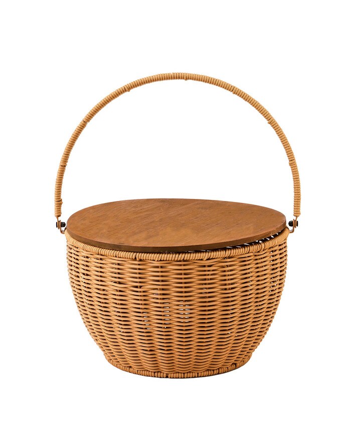 おしゃれピクニックにぴったりのお洒落なラタンバスケット。汚れが拭き取りやすく、お手入れが簡単なPPラタン素材で、バスケットのフタを閉じると、ミニテーブルとしても使えるのでランチ時にも便利ですね。