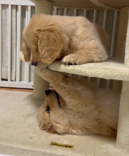 キャットタワーを2段ベッドのように使う子犬達…。 pic.twitter.com/NLwk9vQMCf