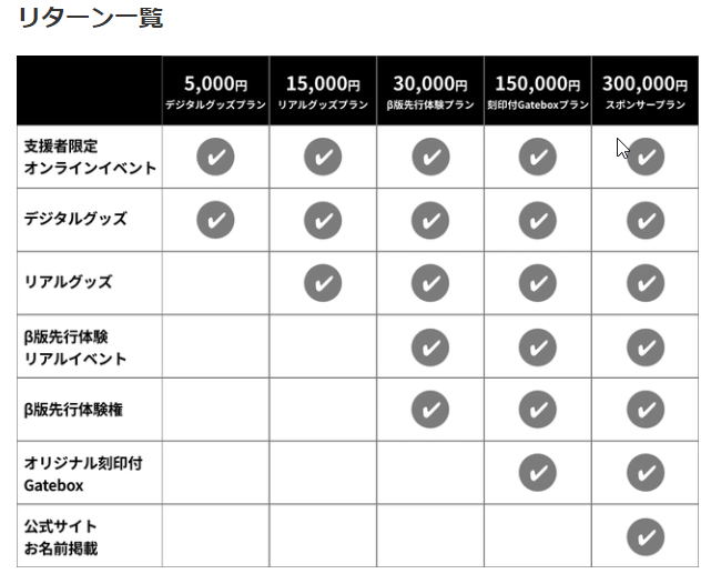 Makuakeのプロジェクトは4月29日まで応募購入が可能です。4月10日時点で購入可能なプランは5000円/1万5000円/3万円/15万円の4プラン(30万円のプランは終了)。それぞれのプランのリターン品は8月末までに提供される予定です。ChatGPTと連携するアップデートは年内を計画しており、既存ユーザーも新規ユーザーも対象になります。