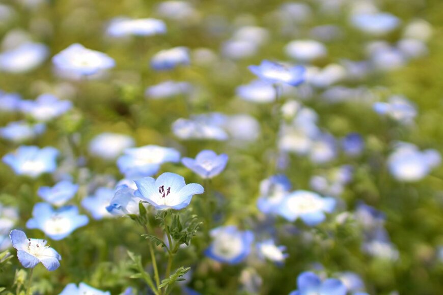 国営昭和記念公園は都心からのアクセスがよく、四季おりおりの花が咲く自然豊かな公園。春になると「ハーブの丘」に咲く約6万株の美しいネモフィラが楽しめます。