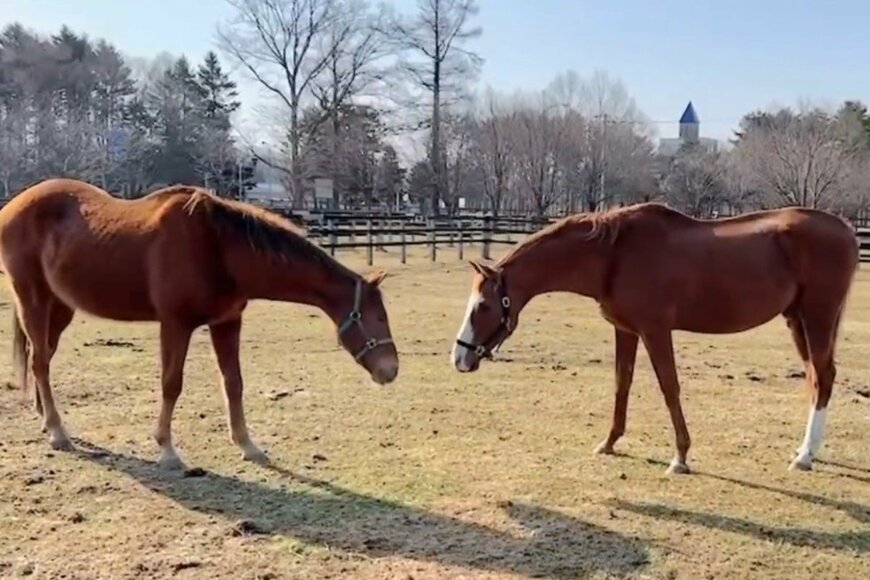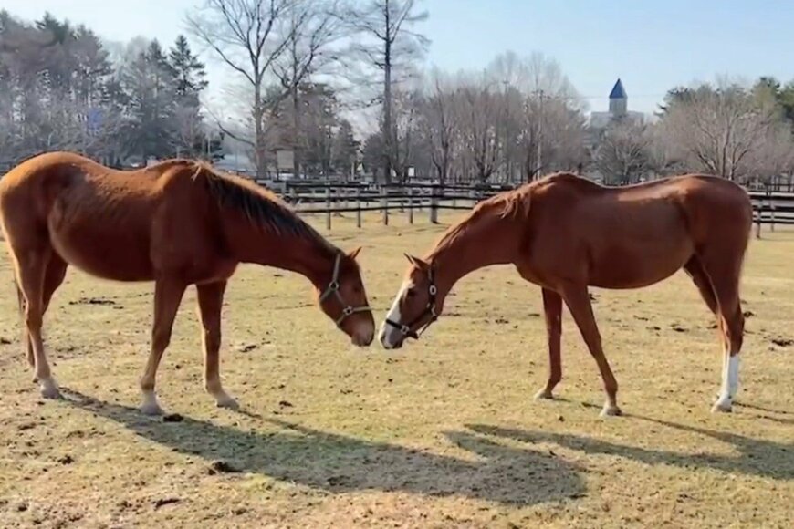 「オウケンブルースリとスズカフェニックスがついに同じ放牧地で過ごすことになりました。2頭が初めて一緒に放牧された日の映像をお届けします。始めは緊張していたようですが、ケンカもせず、すぐに馴染んでくれました。これからどんなコンビになるか楽しみですね」というコメントとともに投稿されたのは、2頭が触れ合う動画でした。