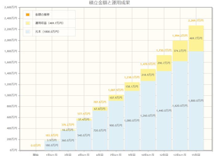 年3%で運用できたとすると、利益は469万7000円となり、15年後には合計で2269万7000円となりました。