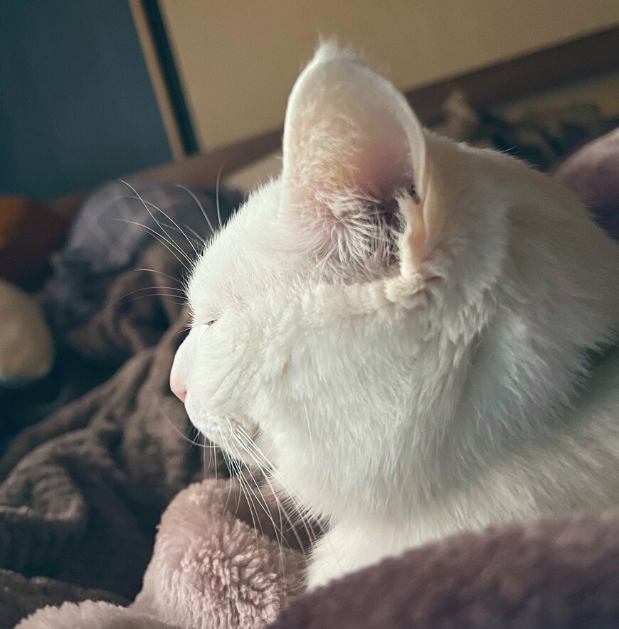 「目を覚ますと、そこにいる。穏やかな顔のネコリアン」そんなコメントとともに、茶色の毛布に包まれる白猫ちゃんの写真が投稿されました。