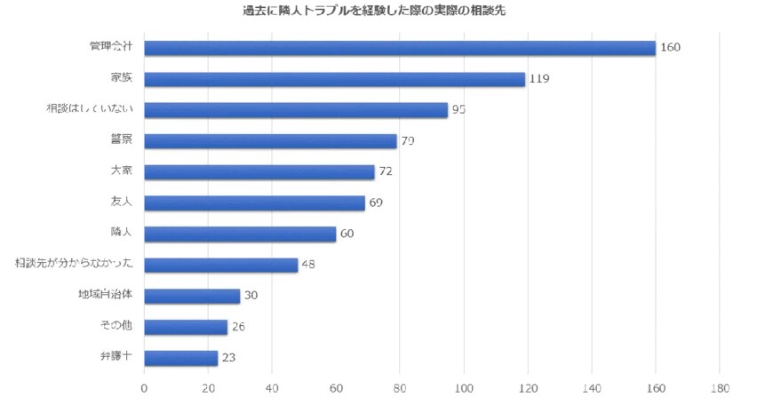 実際、株式会社ヴァンガードスミスの同調査で、近隣トラブルにあった人が「管理会社」や「警察」「大家」に相談しているケースが多いことが分かります。