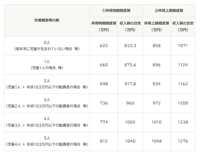 参考までに、次の条件下にある世帯についての所得制限を確認しましょう。