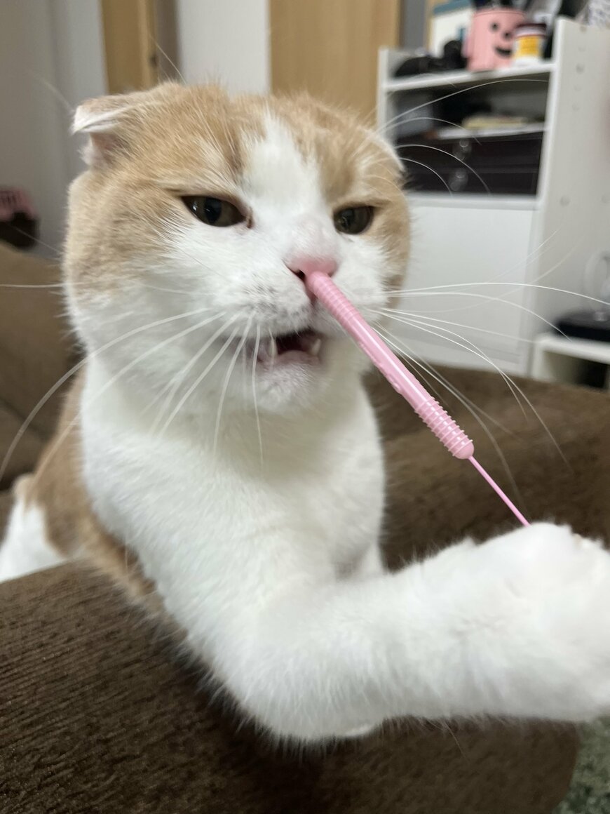 棒で遊ぶ猫ちゃん、写真に写った姿にホッコリ