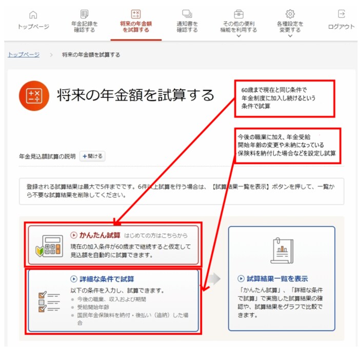 ねんきんネットにログインすれば、「かんたん試算」と「詳細な条件で試算」のいずれかで将来の年金受給額を試算可能です。