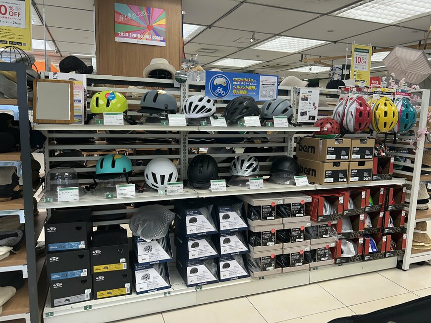 法令の改正によって、自転車用ヘルメットは特需が発生しています。ハンズ(旧東急ハンズ)では各店舗で3月上旬から同カテゴリーの取り扱いを拡大。東京・渋谷店では3月に売り場を3倍に広げ、売上比は前月比で約5倍にまで伸びました。