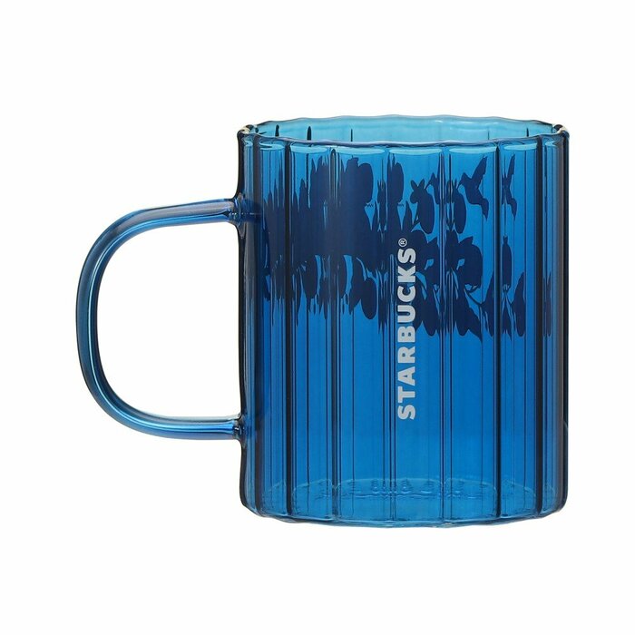 波状になった形状がユニークな耐熱グラスマグです。涼しげなブルーのボディに描かれているのは、スターバックスとかかわりの深い「ハチドリ」とコーヒー豆のパッケージにも描かれている「トラ」とオレンジです。