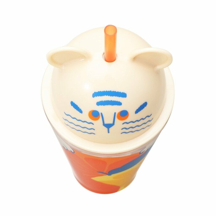 トラ型のドームリッドがかわいらしいコールドカップタンブラーです。トラがオレンジやレモンといったフルーツを抱えている様子をユニークに表現。