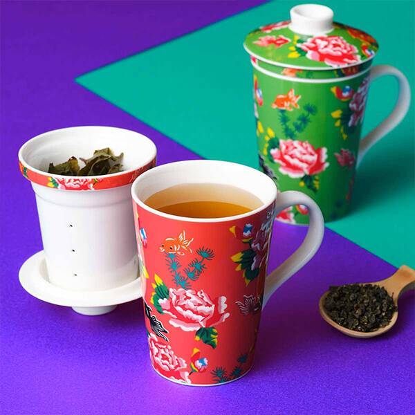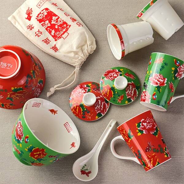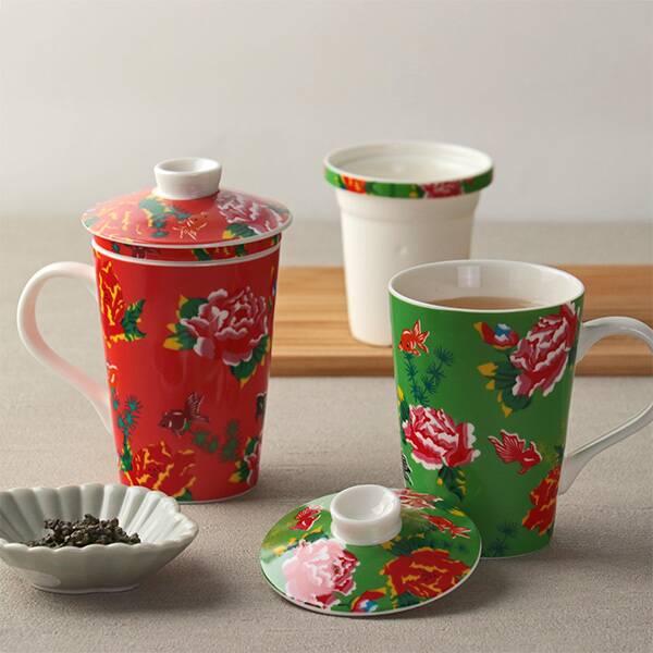 茶こしがついた陶器製のマグカップに凍頂烏龍茶が付いています。客家柄がちょっとレトロな雰囲気のオリジナルデザイン。マグカップの色は【シュイロ】と【ミドリ】の2種類ありますが、お一人様1点と購入に制限があります。