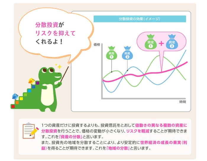 1つのみに投資するよりも、複数の資産や地域に分散して投資することで、基本的に価格変動が小さくなりリスクの軽減となります。