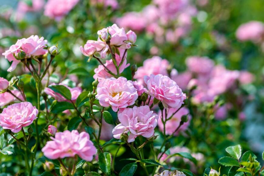 ミニバラは小ぶりの花が株をおおうように開花。比較的コンパクトにまとまるので狭いスペースでも大丈夫です。