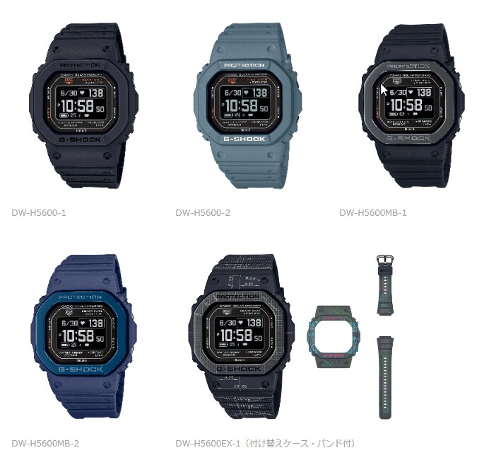 バリエーションはカラーとベゼル素材の異なる5モデル。カラーがブラックでベゼル素材にメタルを採用したモデルには、付け替え可能なケースとバンドを同梱する「DW-H5600EX-1」も用意しています。