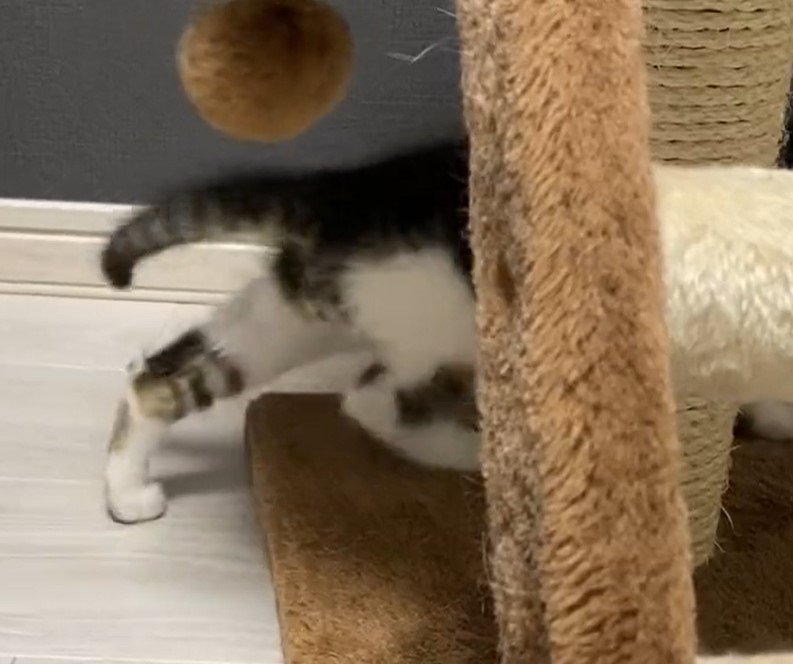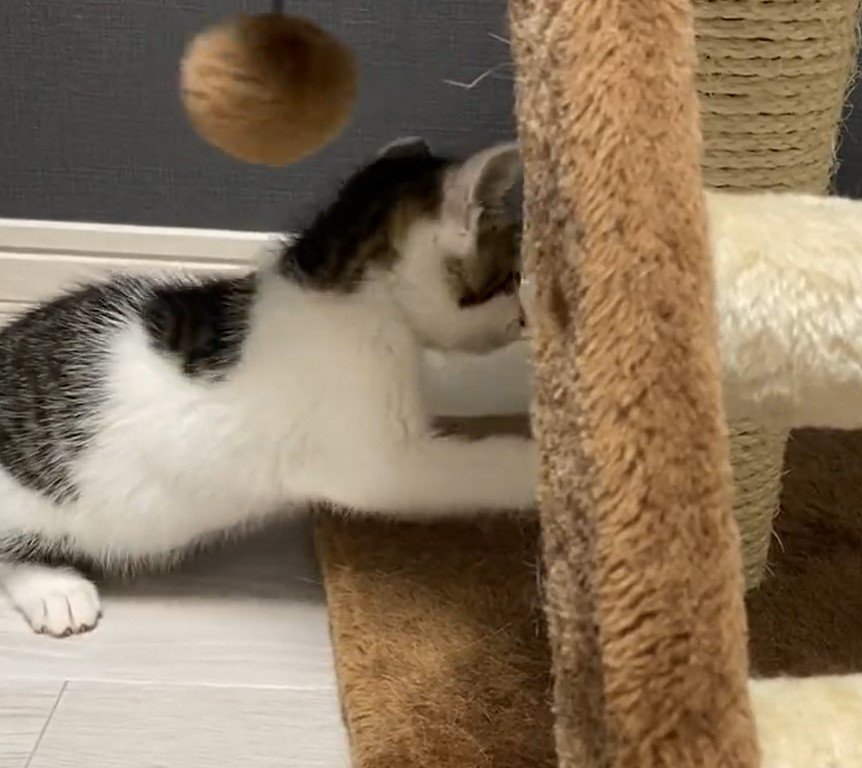 おもちゃ遊びが大好きだというセロイくん。この日は、猫ちゃん用のタワーに付いたボールで遊んでいた様子。目を細めたり、両手を伸ばしたり、小さな身体を俊敏に動かして「シュタシュタ!」とじゃれています。