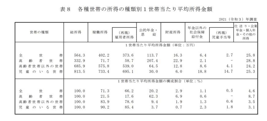 今回は厚生労働省「2021年 国民生活基礎調査の概況」より、高齢者世帯の所得とその内訳を詳しく見ていきます。