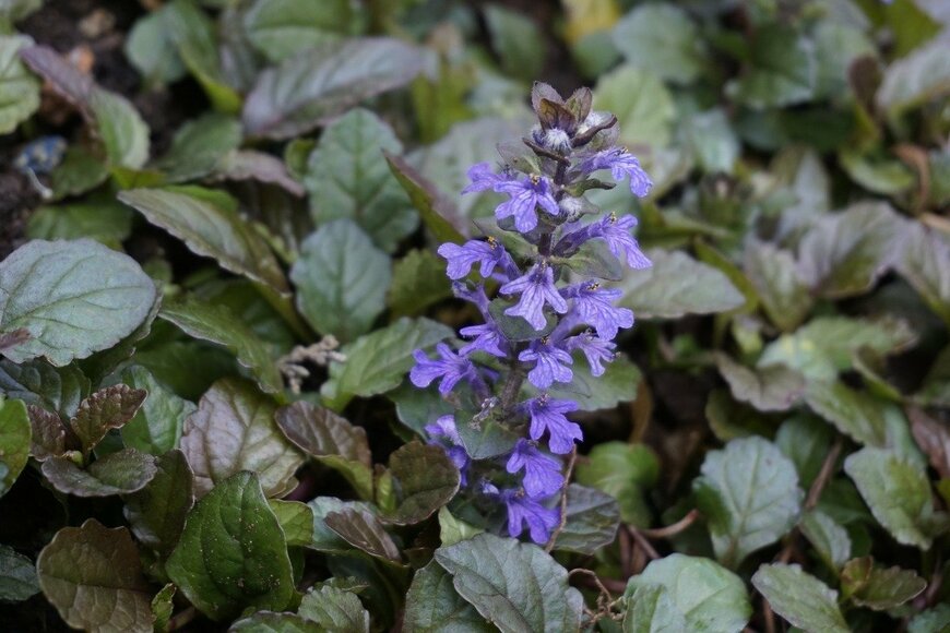 アジュガは丈夫な性質の多年草。葉の模様が多彩で、特に銅葉の品種はオシャレで大人っぽい雰囲気です。