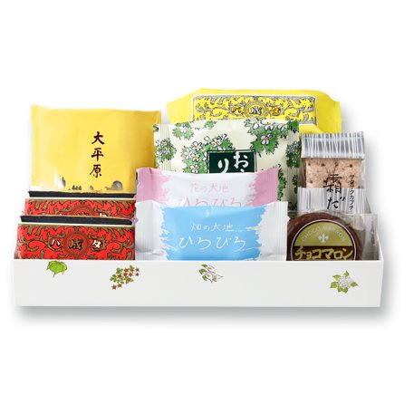 「マルセイバターサンド」、栗あんをビスケットで挟んだ「チョコマロン」、カプチーノ味のサクサクお菓子「霜だたみ」、マドレーヌの「大平原」、「マルセイバターケーキ」、抹茶味のダックワーズ「おふたりで」、ストロベリーチョコのパイ菓子「花の大地ひろびろ」、同じくチョコレートのパイ菓子「畑の大地ひろびろ」というバラエティ豊かなラインナップが揃いました。六花亭の魅力がすみずみまでわかる、大満足のぜいたくセットです。