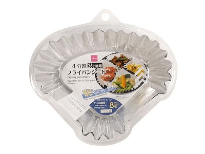 シリコーン樹脂で加工されているフライパンシートです。ちょうど4分の1にカットしたピザのような形のシートが8枚入っています。一度に4枚使うとフライパンを4分割できるので、4種類のおかずを一度に調理できてしまいます。