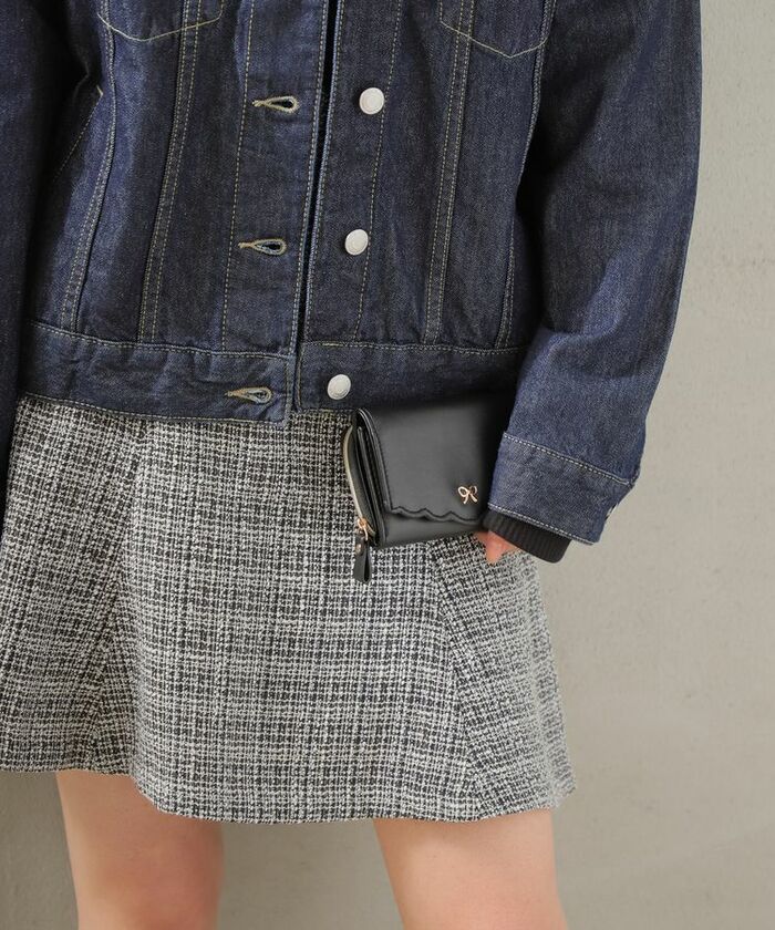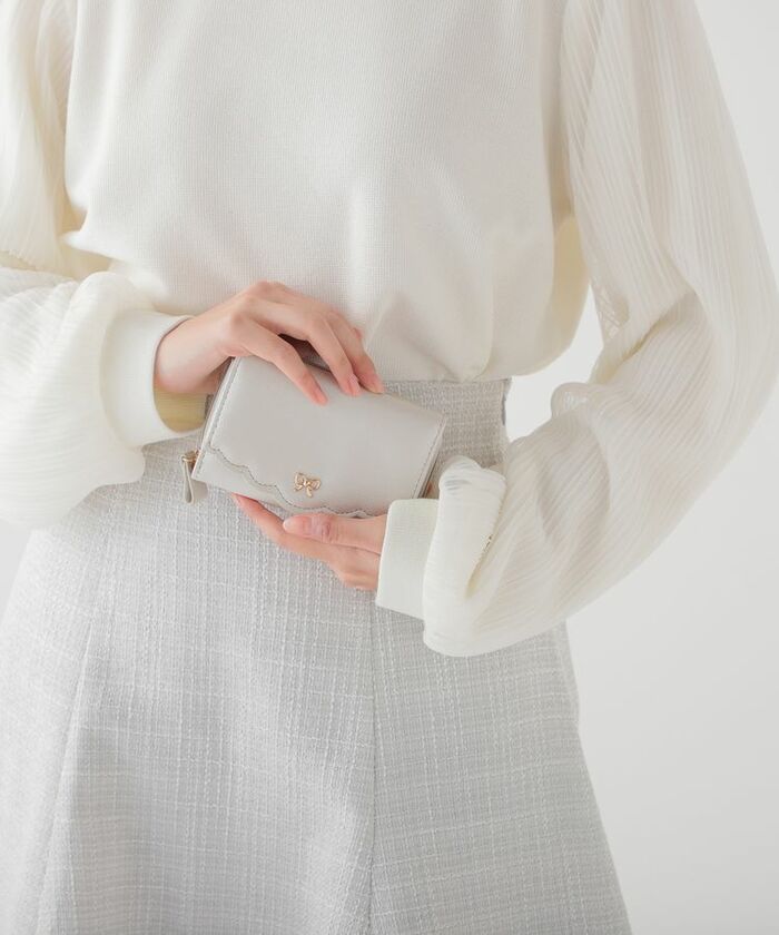 スカラップのカッティングにリボンモチーフを加えることで、上品でありながらフェミニンさもあります。小銭とお札を前後のポケットで分けて収納でき、小銭入れには仕切りもついていて実用性もばっちり。小さめ財布ですが、取り出しやすさにもこだわった商品です。