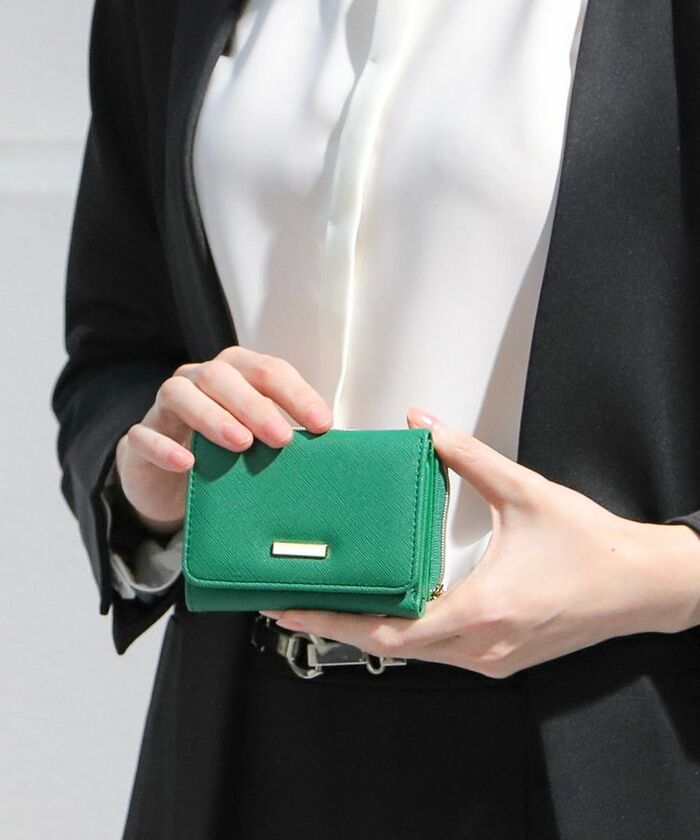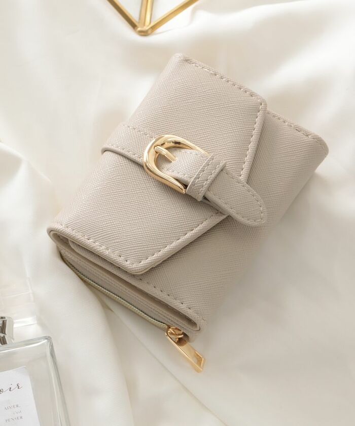 ゴールドプレートとフェイクレザーの組み合わせで高見えも叶う、コンパクトサイズの三つ折り財布です。アイボリー・ブラック・グリーン・グレージュ・ダークブラウンという5色のカラー展開で、コーディネートや用途に応じた色ち買いが手軽に楽しめます。小銭入れとお札入れが分かれているので、収納力もバツグンです。小銭入れにはファスナーがついているので、持ち運びにも安心です。