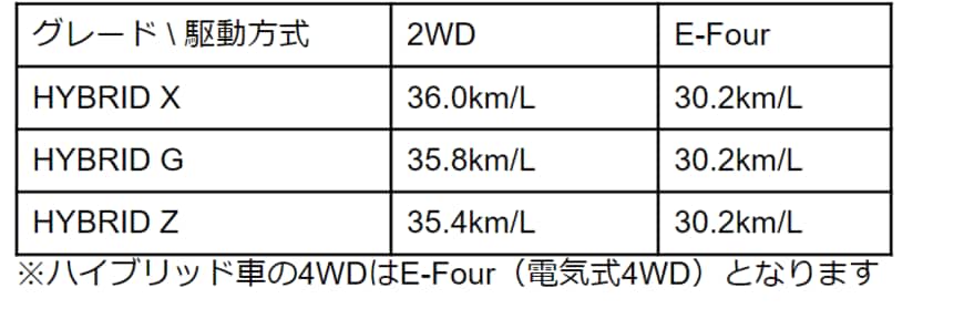 これは車両重量が装備の充実具合によって多くなるためです。E-Four(電気式4WD)の燃費もその機構の重さが影響している言えるでしょう。