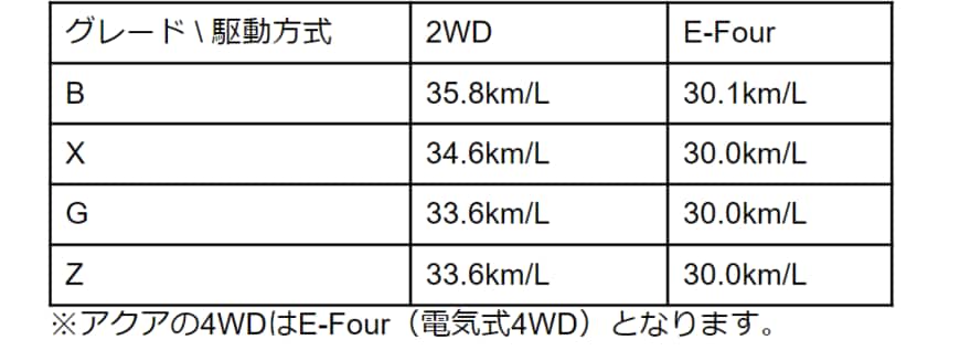 なお、アクアの燃費はグレード間とE-Fourに重量の違いから若干の差があります。