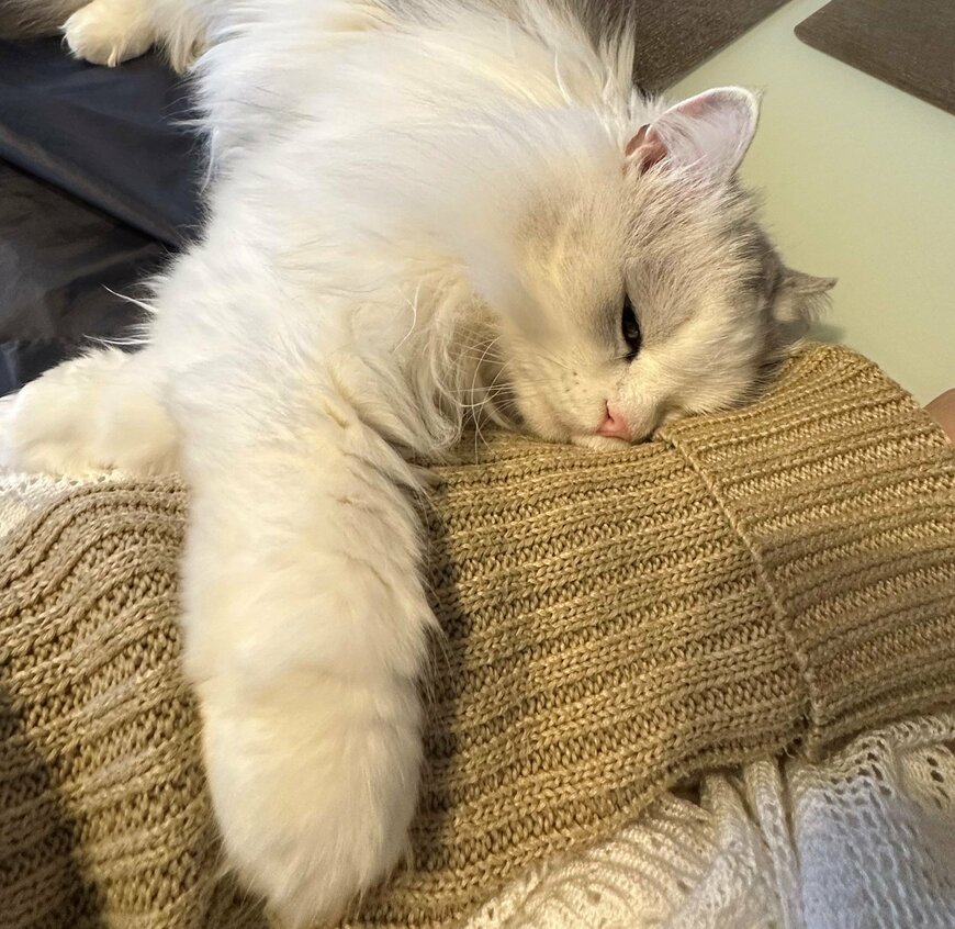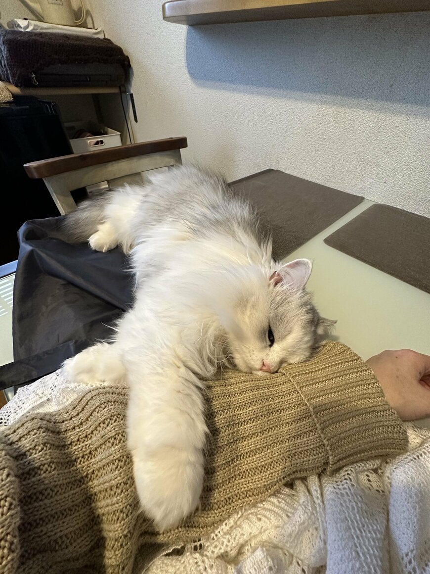 横たわった状態で、ママさんの腕に大胆に手を乗せるノーマンくん。さらに「ウトウト」と非常に幸せそうな表情を浮かべたお顔を、ママさんの腕にぴったりとくっつけています。