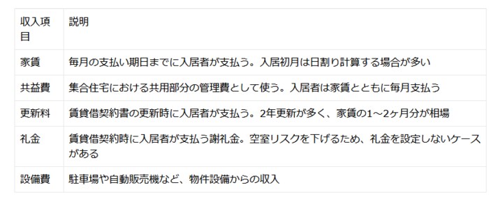 賃貸経営における主な収入は、次の一覧表をご覧ください。