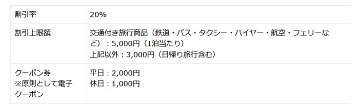 宿泊料金の割引や電車・バスなど交通付き旅行商品の割引、旅行期間中に使用できるクーポン券などの付与が行われています。