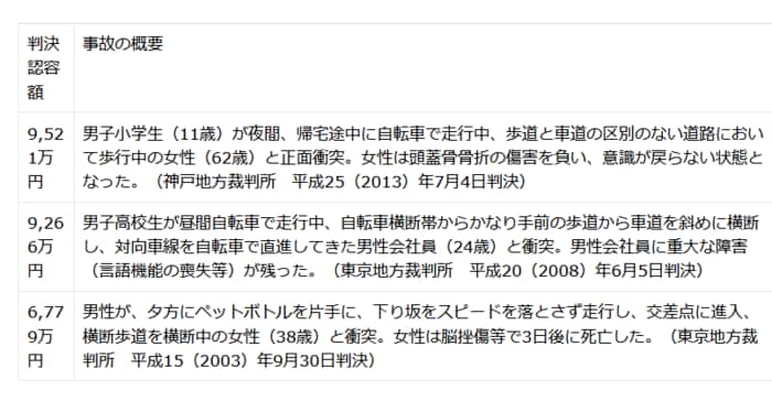日本損害保険協会の調べによると、自転車事故で加害者が判決文で支払いを命じられた判決認容額のなかには、1億円近い金額になるケースもあるようです。
