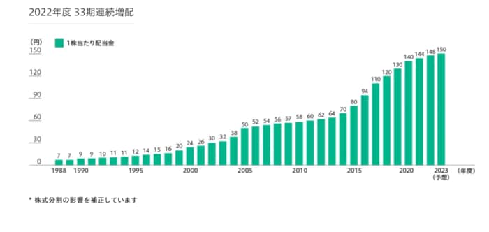 花王は2022年度に33期連続で増配しており、2023年度の配当予想も年間で150円となっており増配の予定を公表しています。