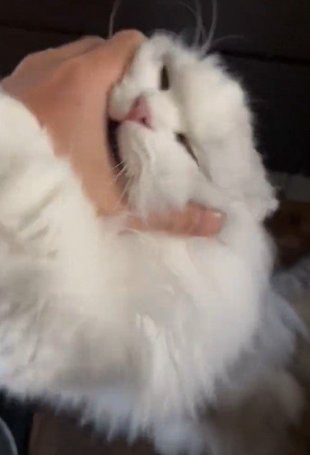 モフッと添えた飼い主さんの手に力は入っていませんが、ノーマンくんは「お構いなし」といった具合で、勢いよくお顔をウリウリ……!動画の終盤になると、両目をつむって「構ってニャー!!」といった表情を浮かべました。