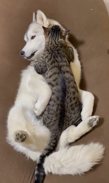 注目を浴びているのは、キジトラ猫の「サン」くんとハスキー犬の「ユキ」ちゃん。2匹はママと子どものような関係で、日頃から仲良く密着してくつろぐことが多いようです。