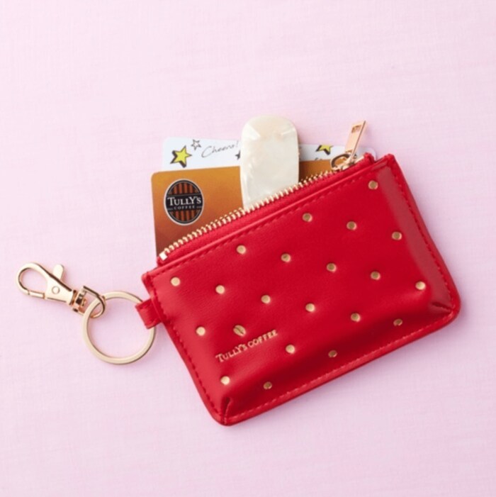 赤い生地にゴールドのドットを型押ししたカードケース。コインやリップが入るファスナー付きポケットと、カード類が入るカードポケットが2つあります。ドットはコーヒーチェリーをイメージし、左中央にコーヒー豆をデザイン。