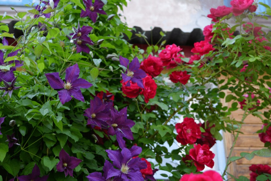 ツル性植物の女王「クレマチス」と花の女王「バラ」は人気の組み合わせです。春はバラとクレマチスが開花する時期。両方の花を近くで植えておくと、さらに豪華な景色を楽しめるでしょう。