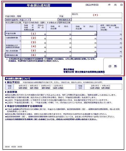 さて、先ほどの「ねんきん定期便」に記載されているのは、あくまでも「見込額」。実際に受け取る金額は、毎年6月に郵送される「年金振込通知書」に記載されています。