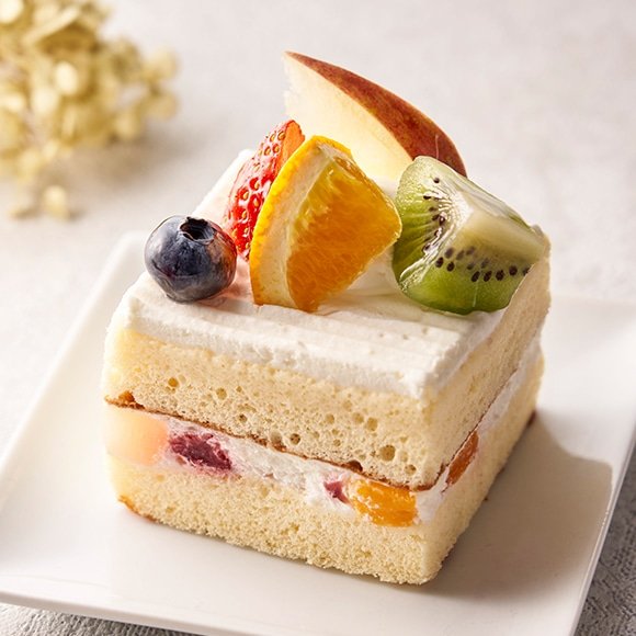 フルーツが大好きなあなたには、こちらの果物たっぷりショートケーキをどうぞ。ホイップクリームと苺・洋梨のシロップ漬け・黄桃のシロップ漬けが、ふんわりしたスポンジにサンドされています。りんご、キウイフルーツ、ブルーベリーなどの新鮮なフルーツの甘さが、口いっぱいに広がりますよ。
