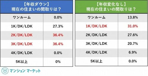 その結果、年収がアップした層が最も多く住んでいる間取りは「3K/DK/LDK」次いで「2K/DK/LDK」となりました。一方、「ワンルーム」あるいは「1K/DK/LDK」に住んでいる人は年収がアップした人で合わせて25%なのに対し、年収が変わらない人は合わせて44.8%と、大きく違いがあるようです。 -