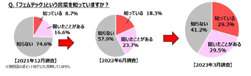 上記調査の結果、「フェムテック」という言葉を知っている人が、昨年と比較して11ポイントアップし、全体の6割近くはフェムテックという言葉を認知していることが分かりました。