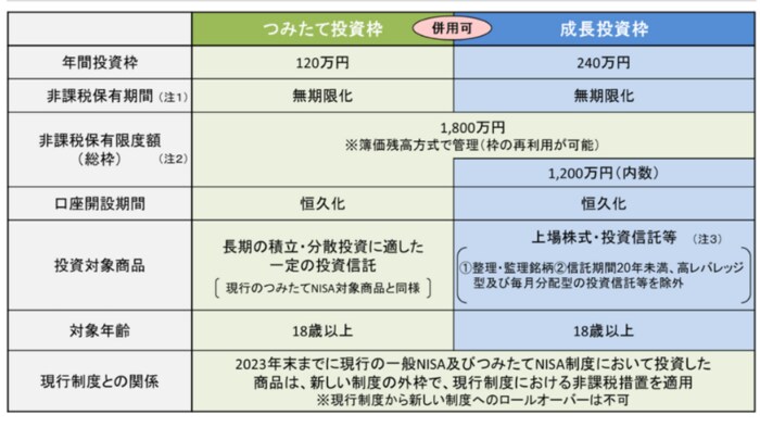 新NISAは「成長投資枠」と「つみたて投資枠」の2つがあり、現行の一般NISAとつみたてNISAのしくみをグレードアップさせたものです。