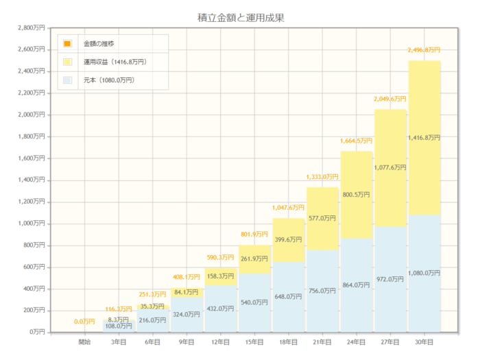 年率5%で30年間運用すると、最終積立金額は約2500万円です。