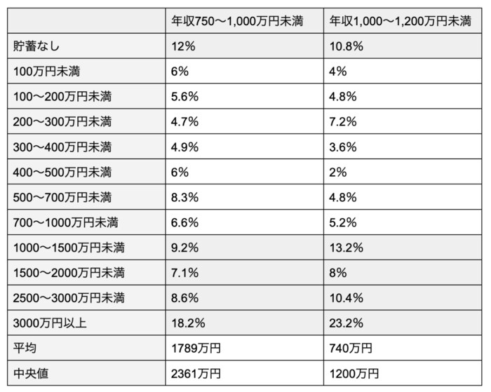 年収1000万円周辺の「750万円〜1200万円未満」の世帯からピックアップし、貯蓄額を一覧表にまとめました。