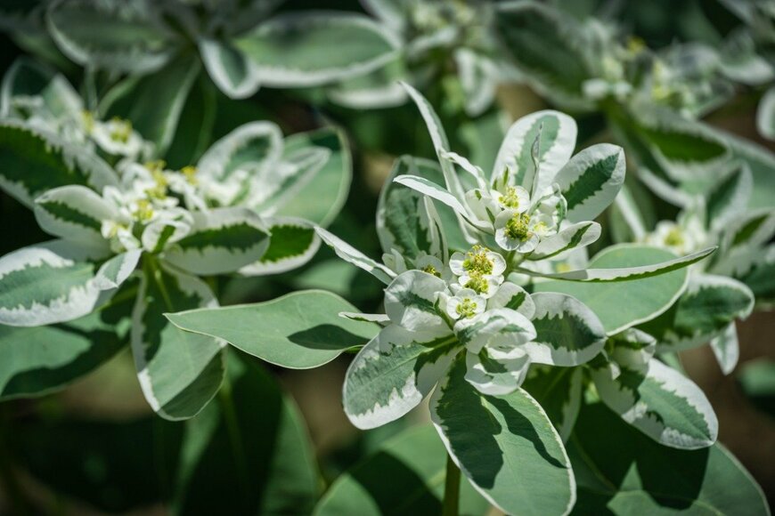 リーフプランツにはハツユキソウを。白い斑が入った葉が涼やかな植物です。ユーフォルビア属のハツユキソウは茎を切ったときに白い液体が出ます。かぶれる可能性があるので触らないようにしましょう。
